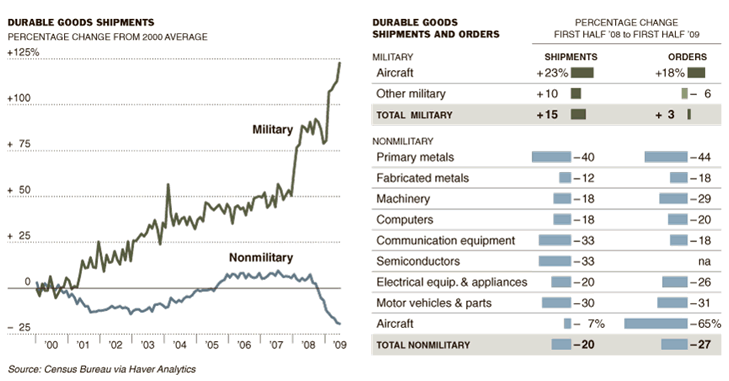 The use of the military-industrial complex as a quick, if dubious, way of jump-starting the economy is nothing new, but what is amazing is the divergence between the military economy and the civilian economy, as shown by this New York Times chart.