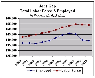 A Decade of Job Stagnation In 2000, 135 million citizens were employed. In 2010 there were 139 million Americans employed. Given the 9.7% increase in population since 2000, we would expect to see at least 148 million citizens with jobs. Nobody much wants to talk about this or the true unemployment figures produced by the US Census called "U6". That measure accounts for, "Total unemployed, plus all persons marginally attached to the labor force, plus total employed part time for economic reasons, as a percent of the civilian labor force plus all persons marginally attached to the labor force." Bureau of Labor Statistics