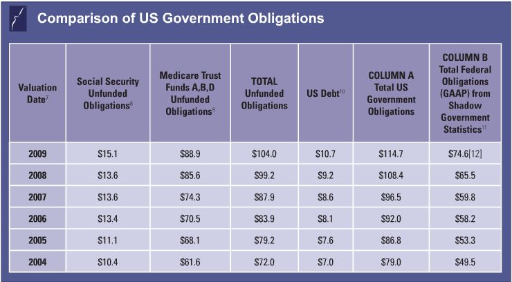 Graphing the national debt and unfunded liabilities thru 2009. Dr. Kotlikoff, economics professor at Boston University, has the 2010 numbers below.