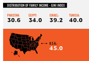 As the US mainstream media references the “oppressive” and “corrupt” inequality of wealth throughout Egypt, the hypocrisy is shameful. The inequality of wealth in the United States is currently the most severe it has ever been. Gini coefficient ratings are a measure of a nation’s inequality – the higher a nation scores, the more unequal the society is. The US has a Gini coefficient rating of 45, compared to Egypt’s 34.4, Yemen’s 37 and Tunisia’s 40, making the US the most unequal, “oppressive” and “corrupt” of the four.