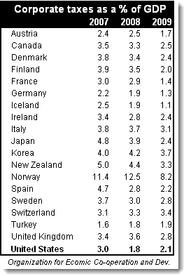 Count on hearing that US corporate tax rates are the highest in the world. This is simply untrue when you count the taxes actually collected. According to the Organisation for Economic Co-operation and Development (OECD), US corporate taxes accounted for 2.1% of the US gross domestic product (GDP-see graph) in 2009, highly favorable compared to the rest of the industrialized world.