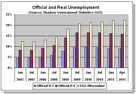 Official unemployment is around 9%. That excludes the marginally employed and under employed. Adding those two groups takes unemployment up to 15.9%. Add the long-term unemployed and the figure climbs to nearly 23%.