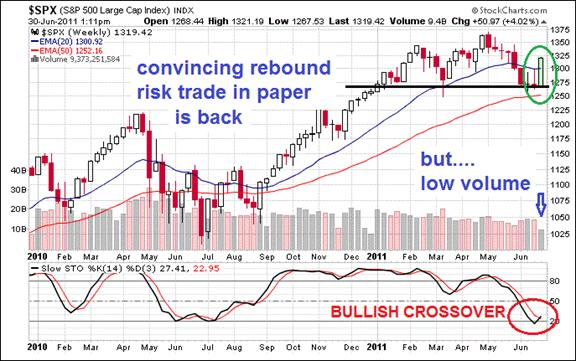 With all the lousy USEconomic news (no need to provide ample detail), the obvious nature of continued fiscal and monetary stimulus has permeated into the financial markets. The most direct beneficiary has been the S&P500 stock index. Stocks have jumped off the double bottom tested low. The entire stock and commodity market can be appropriately described as a risk trade, as in risk of paper securities. The silly empty bluff by the USFed has been called. The USGovt debt limit will be raised, even if on a temporary basis by a small amount. The absurd gesture to release US Strategic Petroleum Reserve crude oil, coupled with a similar release of IEA European oil, has seen an effect come and gone. It was not exactly minimal, but surely fleeting and meaningless. They will replace those reserves with more costly oil, no doubt. No solution has come for the global monetary mess with fracturing sovereign debt. No lasting solution has come to Greece, although the bandaids and chewing gun and bailing wire will assure that another month of tranquility will come, except for minor events like street riots. No lasting solution will ever come to the USGovt budget, where spending cuts are obstructed and tax hikes are obstructed, and war spending will continue into oblivion.