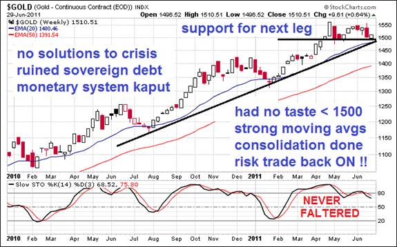 Gold has benefited from the lost credibility of the global monetary system, from the loss of unquestioned faith in the central bank franchise system. Gold represents the mirror image of the crumbling monetary system and its soured debt foundation, managed by dubious central bankers. The system will perpetuate its ruinous debasement of money itself, since the power structure will struggle to preserve itself. It is that simple. In no way will JPMorgan or Citigroup or Bank of America voluntarily commit to bankruptcy and debt restructure, accompanied by impaired asset liquidation. They are the insolvent pillars of the US financial syndicate, firmly in power, never to release that power unless from cold dead fingers. The Gold & Silver prices will continue to make new highs in the second half of the year. We should look forward with juicy anticipation to all the back-peddling by countless analysts who claimed the anti-USDollar trade was over. It was just resting in consolidation. The battle cry remains INFLATE OR DIE!! The system will continue to seek vast resuscitation via harmful inflation, or implode. The latest lousy USTreasury auctions should be viewed as having great importance. The USFed will continue its debt monetization or face failed auctions. Notice the strong signal for continued debt coverage in the S&P500 stock index itself. Crude oil has recovered. Gold & Silver have bottomed. Onward and upward. The great spring shock was administered in empty threats.