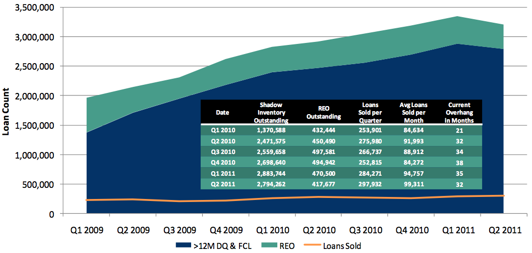 At the end of the second quarter, more than 2.7 million long-delinquent loans, others in foreclosure and REO properties sat in the shadow inventory, more than double what it was in the first quarter of 2010 (Click to expand the chart below). With the market averaging roughly 90,000 loan liquidations per month, it would take 32 months, nearly three years, to move through the overhang.
