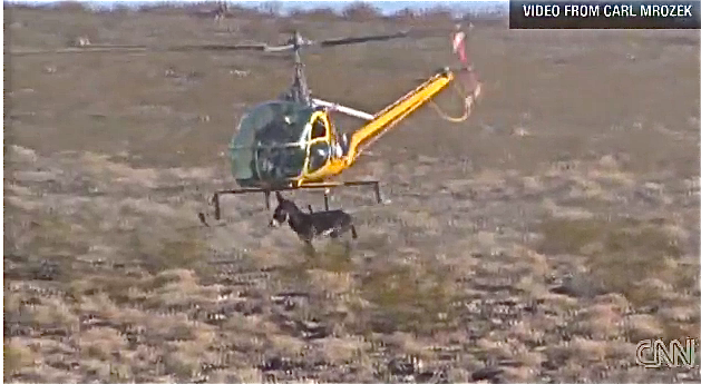 Is it humane for a helicopter to stay on a terrified foal by flying only five feet off his tail when that baby is obviously, to anyone watching, struggling with all his might just to keep up with his family and who is already well into the funnel of the trap? (Click the link to see the video.)