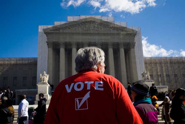 Protestors gather outside of the U.S. Supreme Court in support of Section 5 of the Voting Rights Act of 1965, in Washington, Feb. 27, 2013. The Supreme Court on Tuesday morning, June 25, 2013, announced a vote of 5 to 4 in the Shelby County, Ala. v. Holder case, striking down part of the act. (Photo: Christopher Gregory / The New York Times)