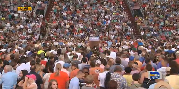 As many as 40,000 people crammed into Ladd-Peebles Stadium in Mobile, Alabama, to greet GOP presidential candidate Donald Trump Friday evening in what is being called the largest 2015 presidential primary campaign event of the season.