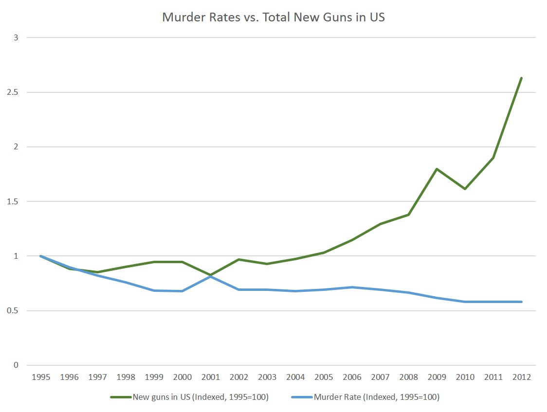 There is simply no demonstrable causal relationship between the private ownership of firearms and murder. In fact, despite an explosion in new gun sales, the trends shown on the graph below have actually accelerated.