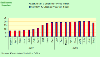 Now one of the most curious details about the present slowdown in Kazakhstan, has been the fact that at the very same time as the economy started to lose velocity the central bank found itself busy struggling to curb an inflation rate which was steadily shooting onwards and upwards towards the outer stratosphere, as revenue from record oil prices pushed up domestic demand, and the resulting construction and consumption boom drove up wages far beyond normal "productivity-gain" rates of increase (remember, there are not THAT many people in the country, and much of the population is rural and unskilled in relation to the needs of a modern technological and services economy). In fact inflation hit year-on-year rates of increase approaching 20% in the autumn of last year (see chart below), although it had dropped by to an annual 18.2% by September.