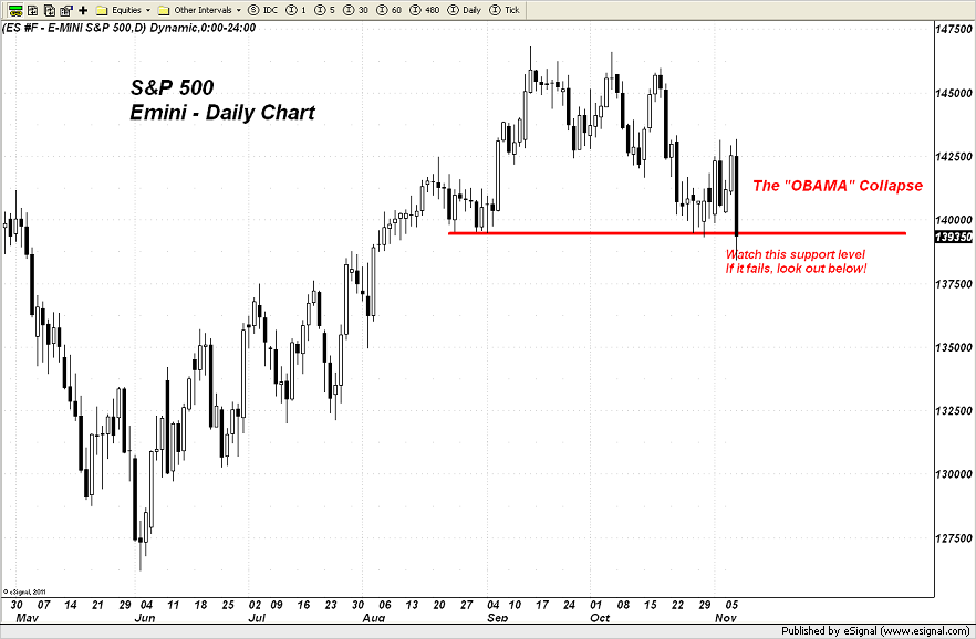 If you have any doubt as to what the markets believe the result of this election is, take a look at the following chart of the S&P 500, the broader measurement of the US stock market. The collapse in the equity markets tells us everything that we need to know about the election results as far as the impact on the economy goes.