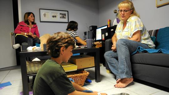 Gretchen Theakston-Larabee, seated on the couch, watches over the studies ofher shildren, from left to right, Sarina, 12, Silas, 7, and Samantha Theakston, 14, at home in Toronto.