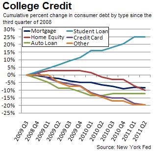 But student loans are up sharply. There was $550 billion in student debt outstanding in the second quarter, up 25% from $440 billion in the third quarter of 2008.