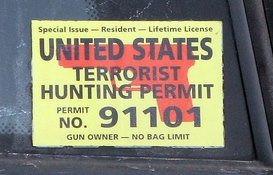 "Volunteer Homeland Security" and "Special issue – Resident – Lifetime License United States Terrorist Hunting Permit – Permit No. 91101 Gun Owner – No Bag Limit"