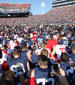 Penn State and Nebraska during a prayer before their game at Beaver Stadium, in State College, Pennsylvania, November 12, 2011. (Photo: Chang W. Lee / The New York Times)