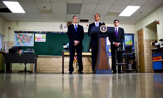 President Barack Obama delivers remarks on education and budget priorities, while Jack Lew, Director of the United States Office of Management and Budget, right, and Arne Duncan, Secretary of Education, look on at the Parkville Middle School and Center of Technology, in Baltimore on February 14, 2011. (Photo: Drew Angerer / The New York Times)