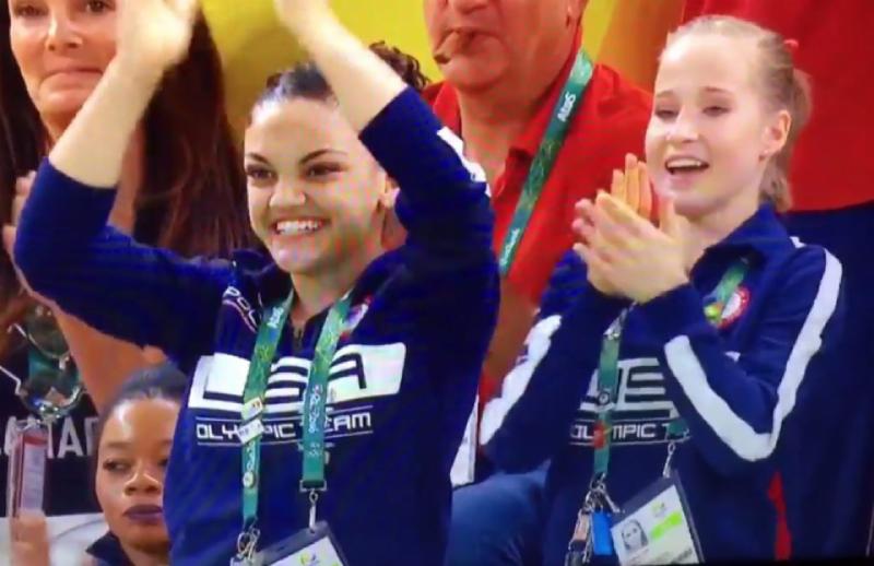 ![]() After having been elimated, sore loser Douglas had no desire to honor the national anthem nor to cheer for her teammates. Notice how disinterested she is as her other teammates (who had also been eliminated) cheer on for the remaining American girls. |