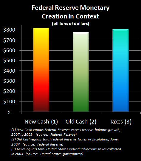 The numbers are so large that they may lose meaning, so let’s place this new money in perspective. Total physical cash in circulation – all the $1, $20, $100 bills and so forth – was $775 billion as of June 2007. By creating $819 billion in excess reserve balances, and handing it to Wall Street and the major banks, the Fed directly created more new cash in less than two years than the total US physical cash in circulation after more than 230 years. If we take into account that about half of US physical dollars are believed to be held overseas, the Fed created 2 dollars in new cash for every existing physical dollar actually in the United States. Now, only a minority of total cash takes physical form these days, most is just electronic digits on bank computers, but the comparison is illuminating nonetheless.