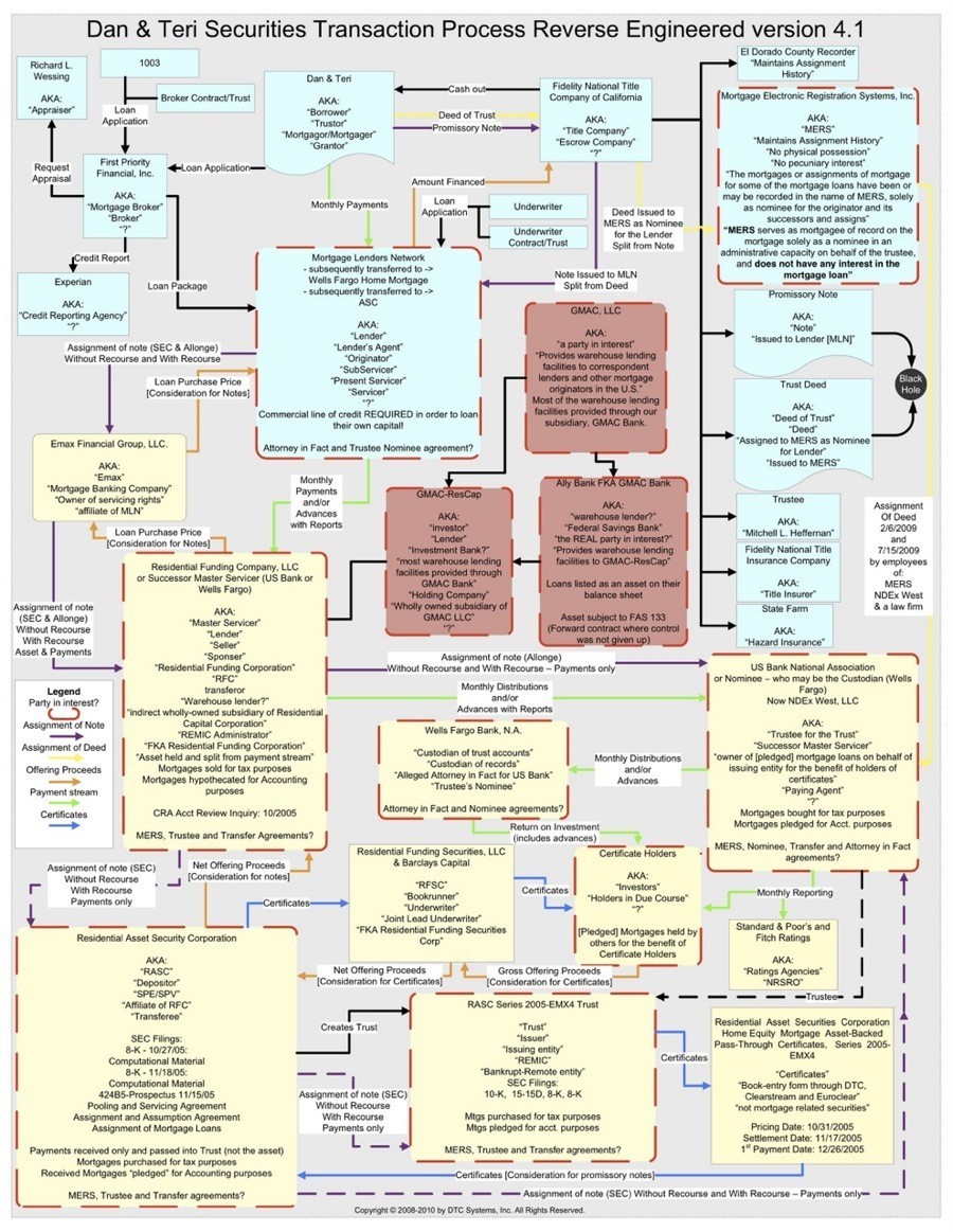 Dan Edstrom, of DTC Systems, who performs securitization audits, and who is giving a seminar in California next month, spent a year putting together a diagram that traces the path of his own house's mortgage. "Just When You Thought You Knew Something About Mortgage Securitizations," says Zero Hedge, you are presented with this almost hilariously complicated chart.