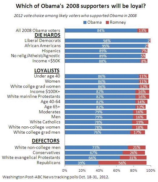 There is not one constituency group that reasonably can be seen increasing its support for Obama. Hardcore Democrat groups are uninspired. Turnout among them will be lower. Obama will win these groups by overwhelming majorities, but the groups will be much smaller this time around.