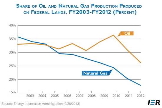 While oil and gas production on private and state lands has been booming, production on federal lands has been a disappointment. Natural gas production on federal lands has been on a downturn for years. Oil production, however, was increasing and hit a high in fiscal year 2010. But due to Obama Administration policies after the Deepwater Horizon accident in the Gulf of Mexico, offshore oil production has been in a decline and is not expected to turn around until 2014.