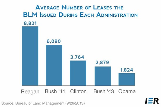 While the Deepwater Horizon accident is the conduit for the offshore drilling decline, the track record set by the Obama Administration on new onshore leases is abysmal. The following chart shows the average number of new leases that the Bureau of Land Management issued during each administration. While the trend is down under all administrations covered, the Obama Administration had the lowest—half that of the Clinton Administration and a third less than the George W. Bush Administration.[vii]